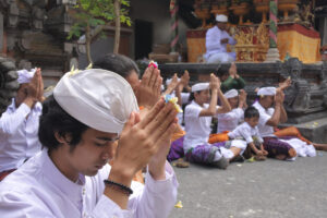Balinese family celebrating Galungan Kuningan holidays in Bali Indonesia